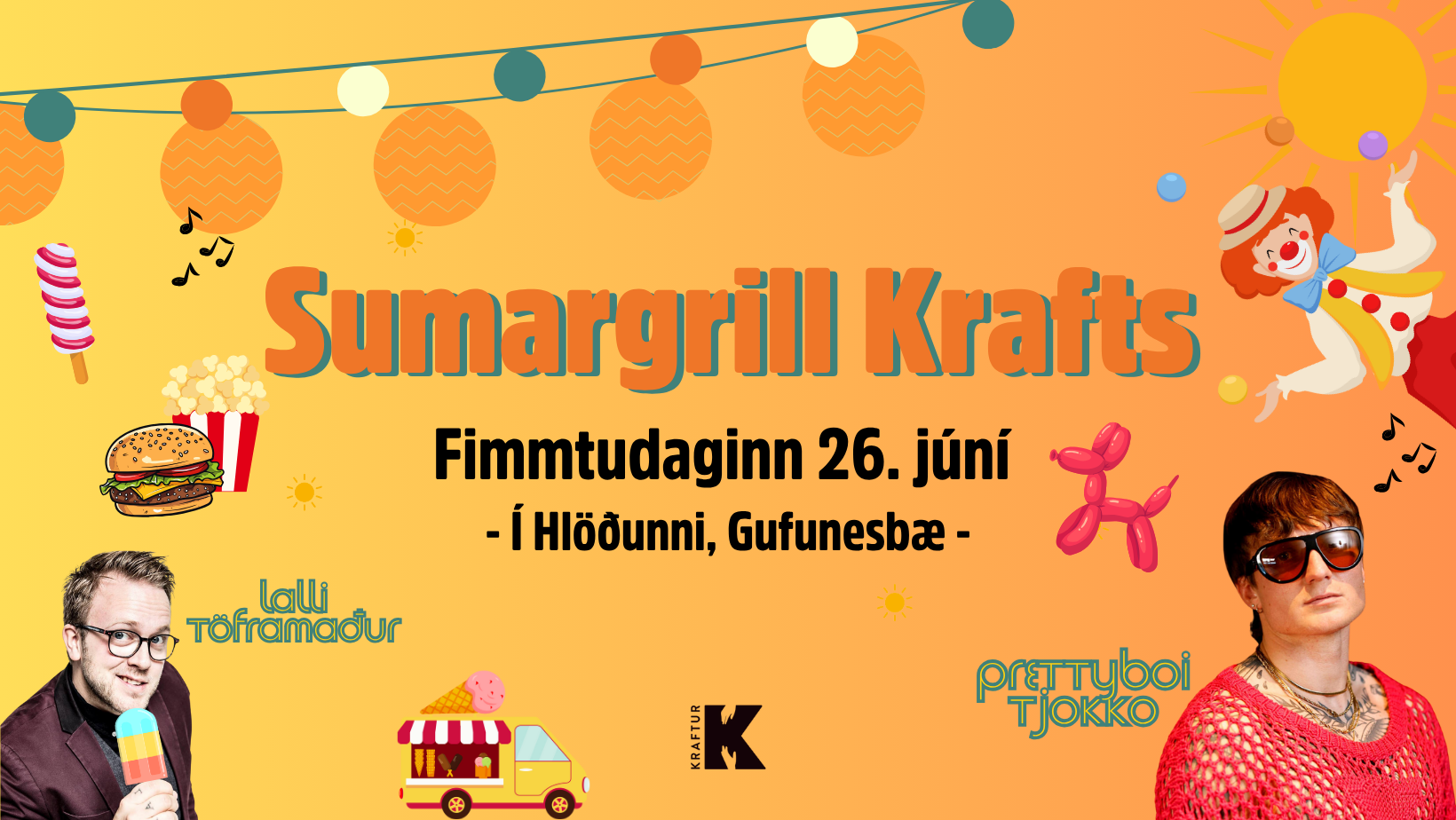 SUMARGRILL KRAFTS: Fimmtudaginn 26. júní, kl.18-19:30Sumargrillið er haldið fyrir félagsmenn og fjölskyldur þeirra ár hvert og í ár verður þessi skemmtilegi viðburður haldinn í Hlöðunni Gufunesbæ! Það verður nóg um að vera fyrir alla aldurshópa en Sumargrillið er hugsað sem fjölskylduskemmtun sem minnir okkur á að njóta líðandi stundar, því lífið er núna! Hamborgararbúllan verður á staðnum, ísbíllinn mætir, andlitsmálun fyrir þau yngstu, Lalli töframaður mætir, blöðrudýr, allskyns skemmtilegir leikir í boði, Sirkus Íslands og enginn annar en Prettyboi Tjokko mætir á svæðið!