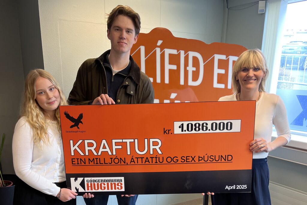 Eftir vel heppnaða góðgerðarviku á dögunum á þeirra vegum, safnaði félagið alls 1.086.000 kr. Virkilega glæsilegt og skemmtilegt framtak, sem við hjá Krafti erum mjög þakklát fyrir. Það voru flottir fulltrúar frá Huginn sem afhentu Sólveigu, framkvæmdastjóra Krafts (og fyrrum menntskælingi, sem var augljóslega stolt af nemendafélaginu sínu) þessa veglegu gjöf!