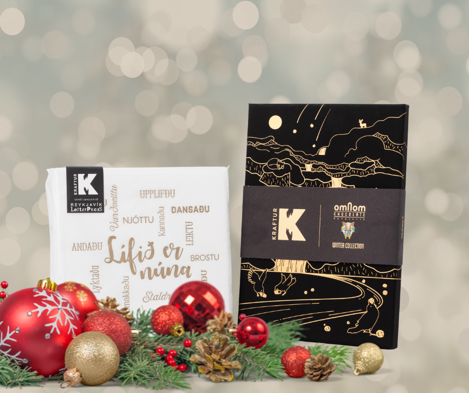 - Lífið er núna – Hátíðarservíettur með áletruninni „Lífið er núna“ sem minnir okkur á að lifa í núinu. Áletrunina er hægt að fá silfurlitaða eða gullitaða og servíetturnar svartar eða hvítar. Dúnmjúkar servíettur, hannaðar og prentaðar í samstarfi við Reykjavík Letterpress.