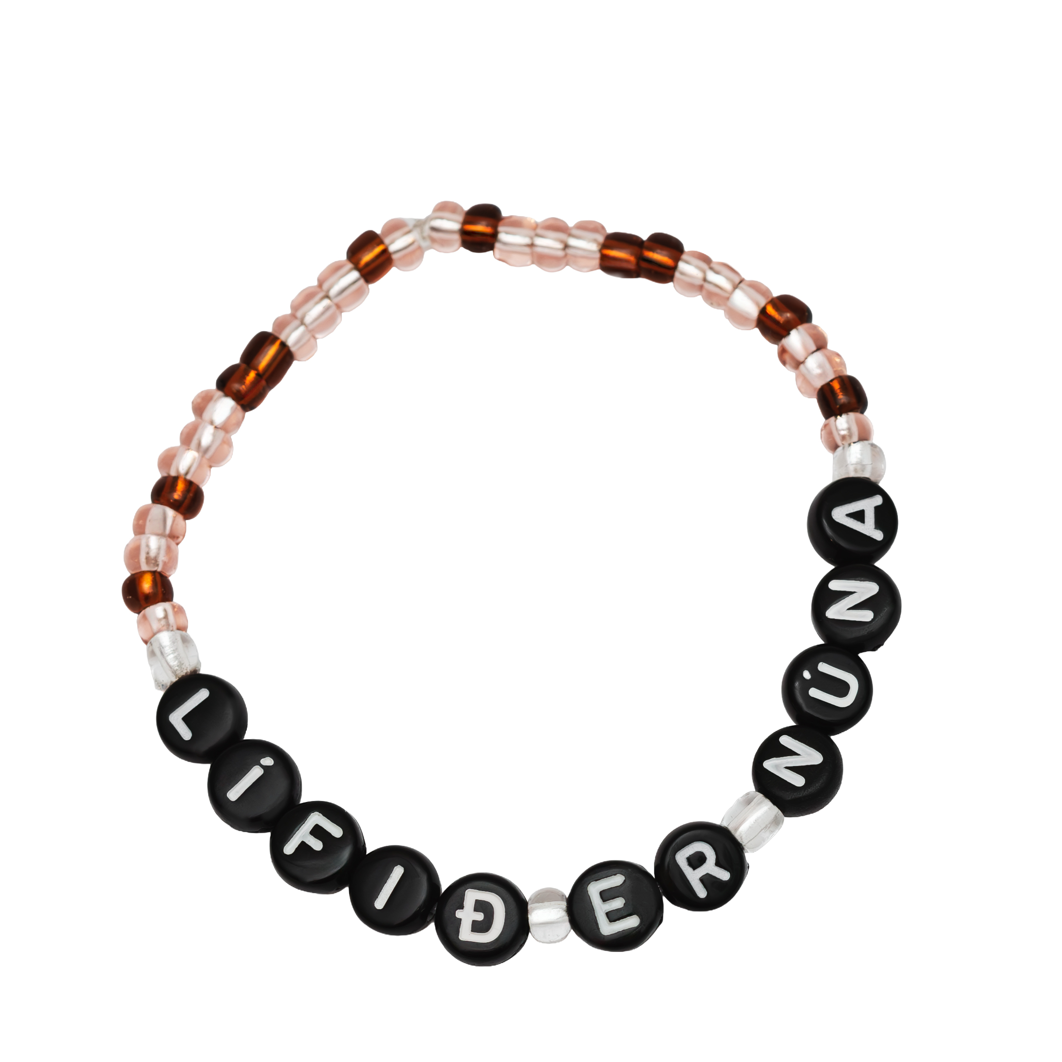 Rósagyllt perluarmband með áletruninni „Lífið er núna“.